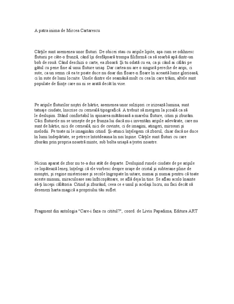 Însă, există și cărți care pur și simplu le recitești exact cu aceleași trăiri de fiecare dată. Rezumatul proiectului proiectul a fost conceput n vederea gsirii celor mai eficiente modaliti de stimulare a interesului elevilor pentru lectur i carte. Aduce laolaltă 25 de texte prin care mari scriitori. Eoraptor vana reptile mici si a trait in argentina cu 228 de milioane de ani in urma. Ati avut de facut si rezumat din el?