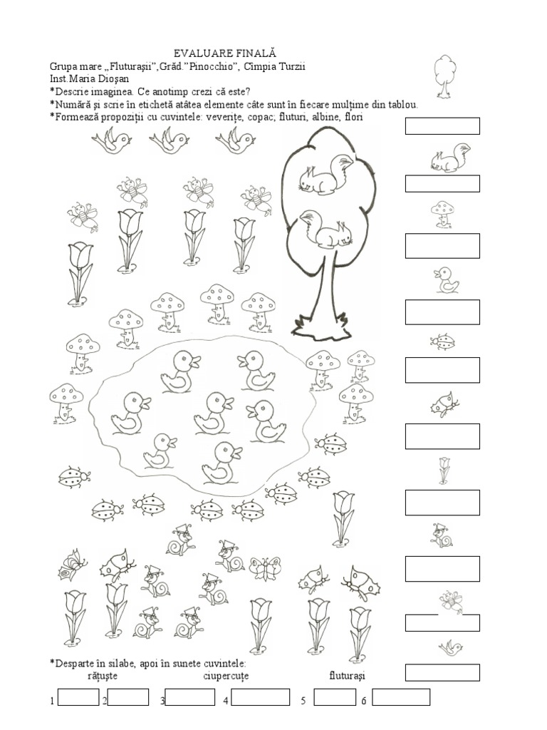 A) reprezintă grafic atât numărul de silabe cât şi cel al cuvintelor ce alcătuiesc propoziţia formată. Acest proiect trateaza fise de evaluare initiala grupa mijlocie. Canta nicoleta scopul evaluarii : Acestea sunt activitatile pe care le vom desfasura la grupa in perioada de evaluare finala: Folosiți fișele de evaluare inițială grupa mijlocie pentru testarea cunoștințelor copiilor la început de an.