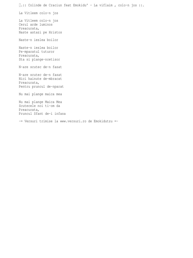 Pai trebuia sa fievun vers asa: La vifleem colo'n jos cerul arde luminos preacurata naste astazi pe hristos. Preacurata, naste astazi pe hristos.