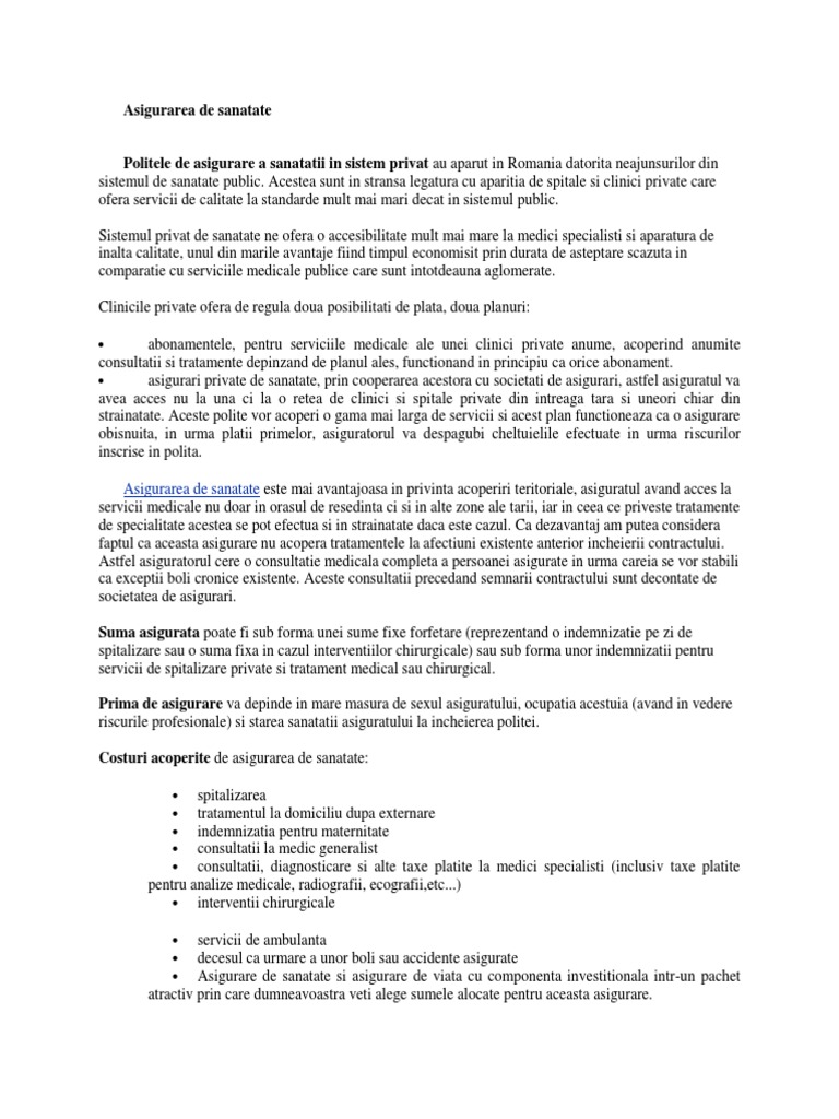 Asigurari private de sanatate pentru angajati. Deja poti sa uiti de hartii sau puncte de intalnire pentru ca asigurarea ta de sanatate. Serviciile se deconteaza integral sau cu anumite deduceri de catre clinicile si spitalele private, din.
