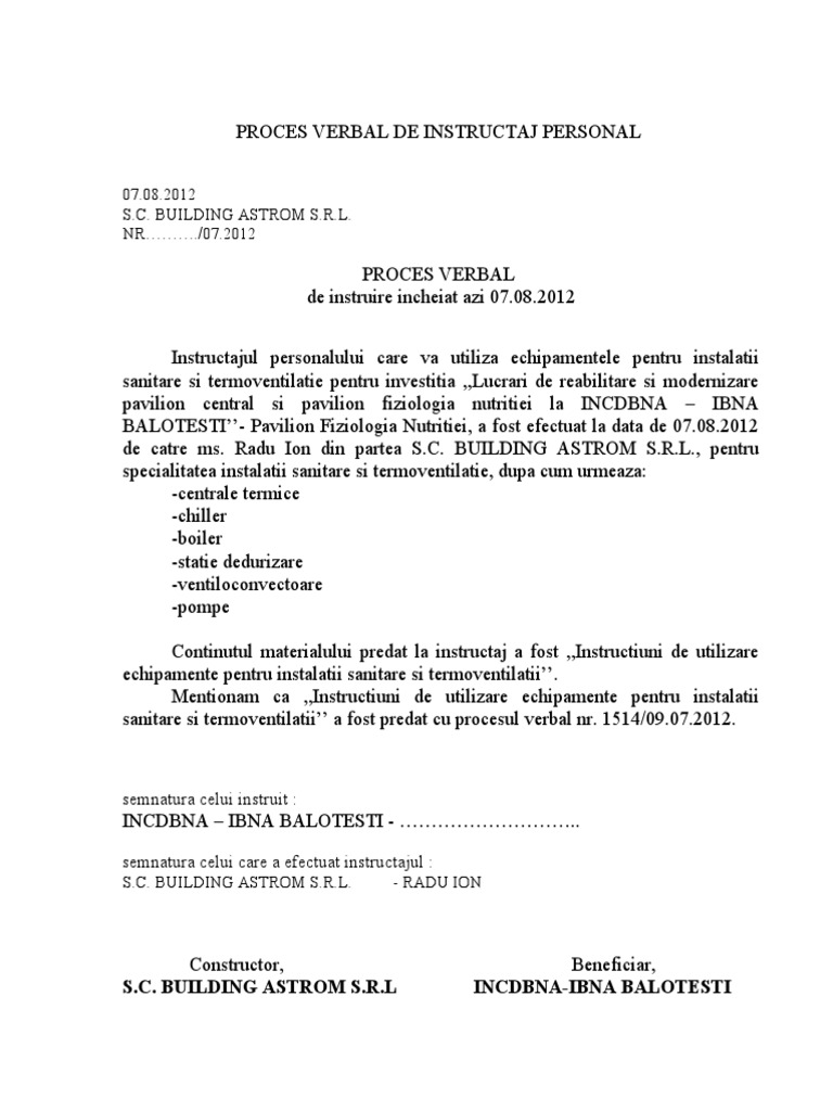 Proces verbal al ședinței grupului de lucru pentru revizuirea strategiei de dezvoltare a. In dovedirea motivelor enuntate inteleg sa ma folosesc de proba cu acte, proba cu expertiza tehnica si proba cu urmatorii martori plangerile formulate impotriva proceselor verbale de constatare a contraventiilor intocmite de agentii constatatori r.a.t.b. Model de proces verbal de predare a unei gestiuni alimentare.