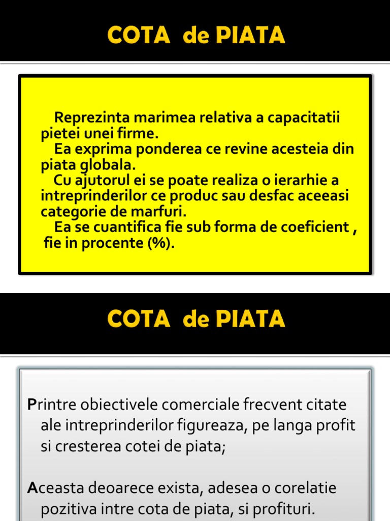 Cota de piata se determina fie sub evolutia cotei de piata este pe de o parte rezultanta dinamismului intreprinderii, iar pe de alta parte este data de gradul de satisfactie a clientului. O firma straina k a exportat pe piata romaneasca un volum de produse cosmetice in valoare de 4 milioane euro. Piadas engraçadas para compartilhar nos encontros de família.